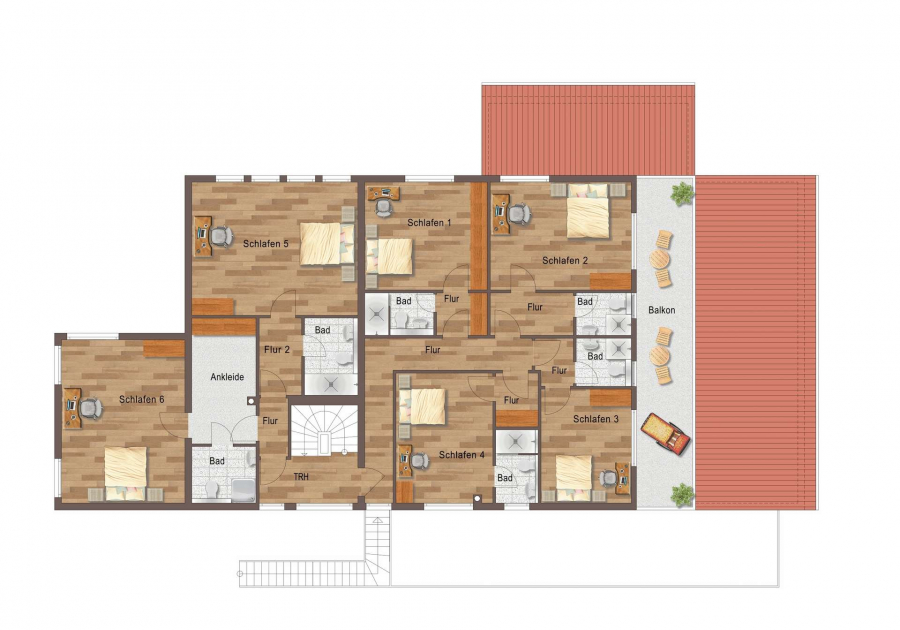Im 1. Obergeschoss befinden sich derzeit 6 Hotelzimmer mit insgesamt 13 Betten. Die Auslastung ist aufgrund der Nähe zur Industrie in Wesseling und Hürth, zur Kölner Messe und zum Phantasialand Brühl sehr gut. Die ehemalige Betreiberwohnung mit einer Wohnfläche von ca. 100 m² liegt im Dachgeschoss. Diese könnte alternativ auch als Ferienwohnung vermietet werden Mit überschaubarem baulichen Aufwand wäre auch eine Umwandlung in 3 weitere Hotelzimmer mit 7 – 8 Betten möglich; für jedes dieser potentiellen Zimmer wäre bereits ein entsprechendes Badezimmer vorhanden.