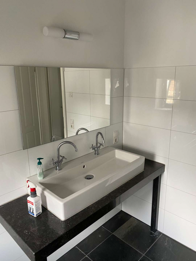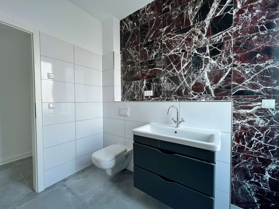 - Wandbelag in Badezimmern und Treppenhaus teilweise aus hochwertigem Naturstein