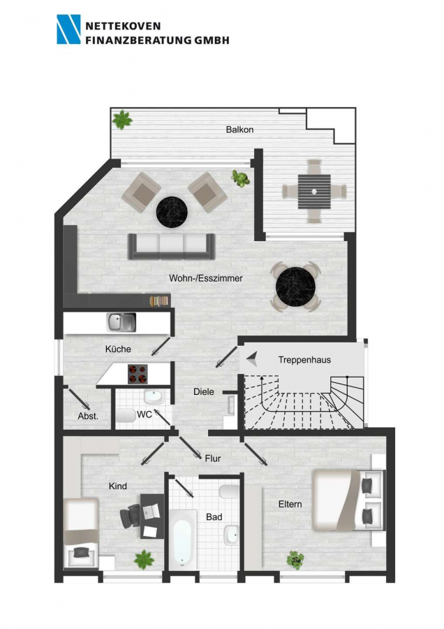 Die Wohnungseingangstür führt Sie in die zum Wohn-/Esszimmer hin offene Diele, von der aus Sie auch die Küche und das Gäste-WC erreichen. Ebenfalls aus der Diele erreichen Sie durch eine Tür den separierten Schlaftrakt mit den beiden Schlafzimmern und dem Tageslichtbad.